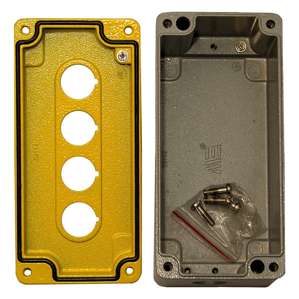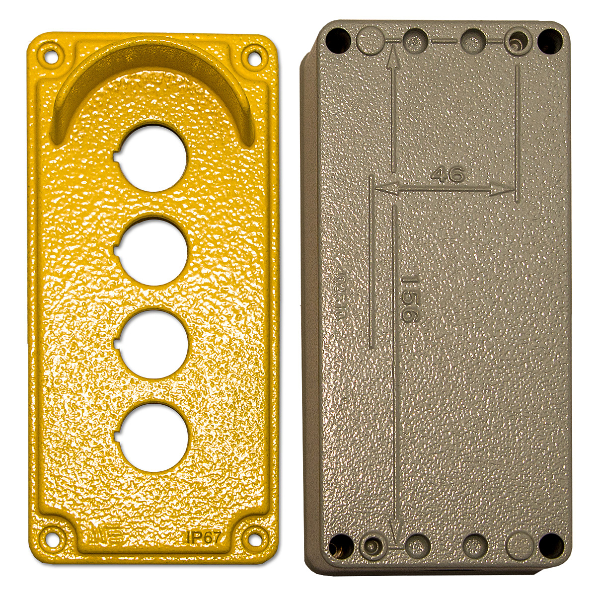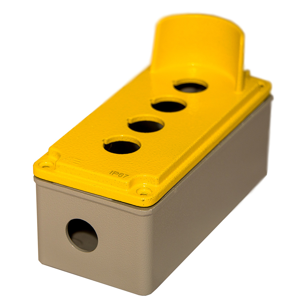 Кнопочный пост алюминиевый, 165x75x67, 4 отв. [4x22,5ммØ], IP67, крепление крышки - винты, уплотнитель - полиуретан, ударопрочность - IK09, цвет: корпус - серый RAL 7040, крышка - желтый, корпус - алюминий, крышка - алюминий.
