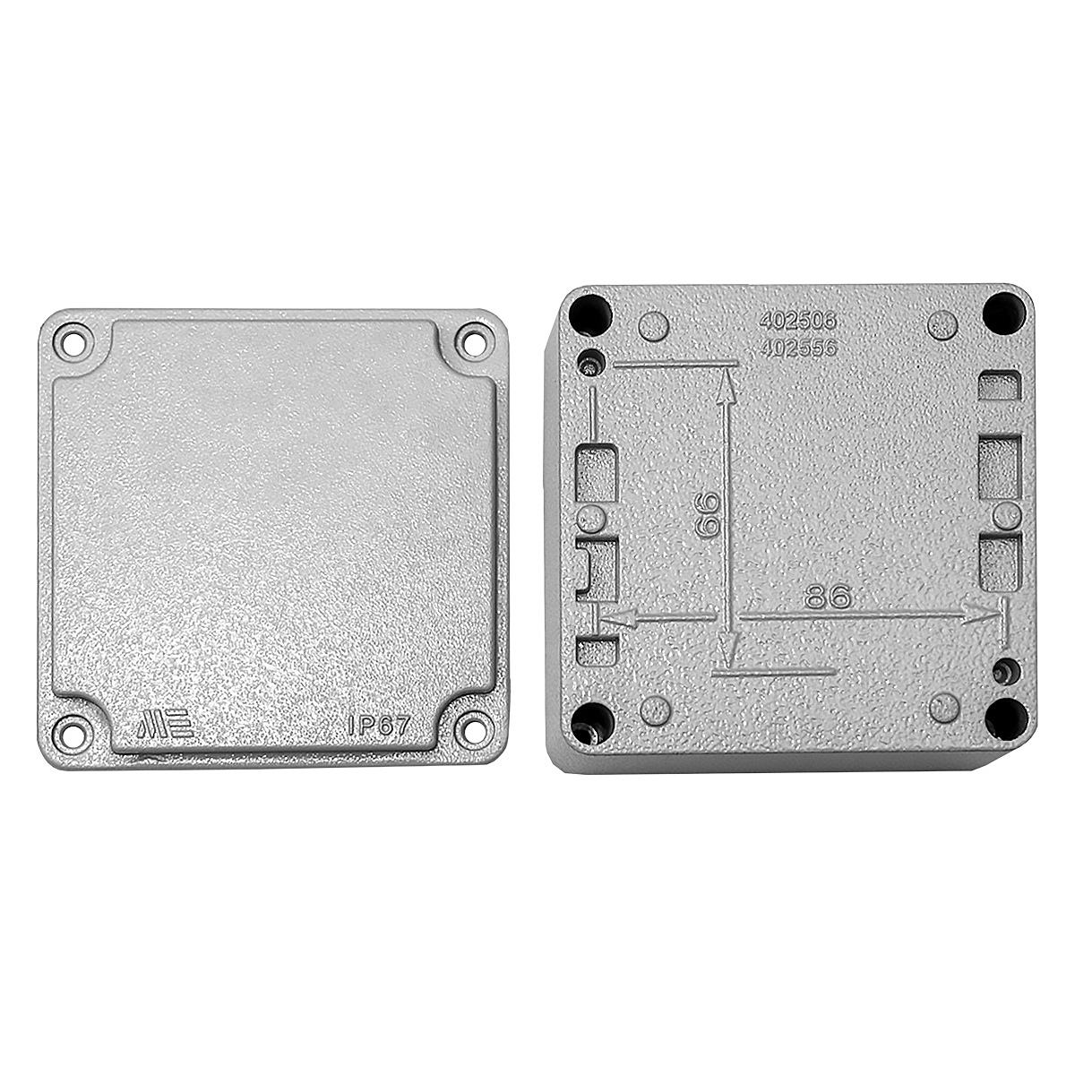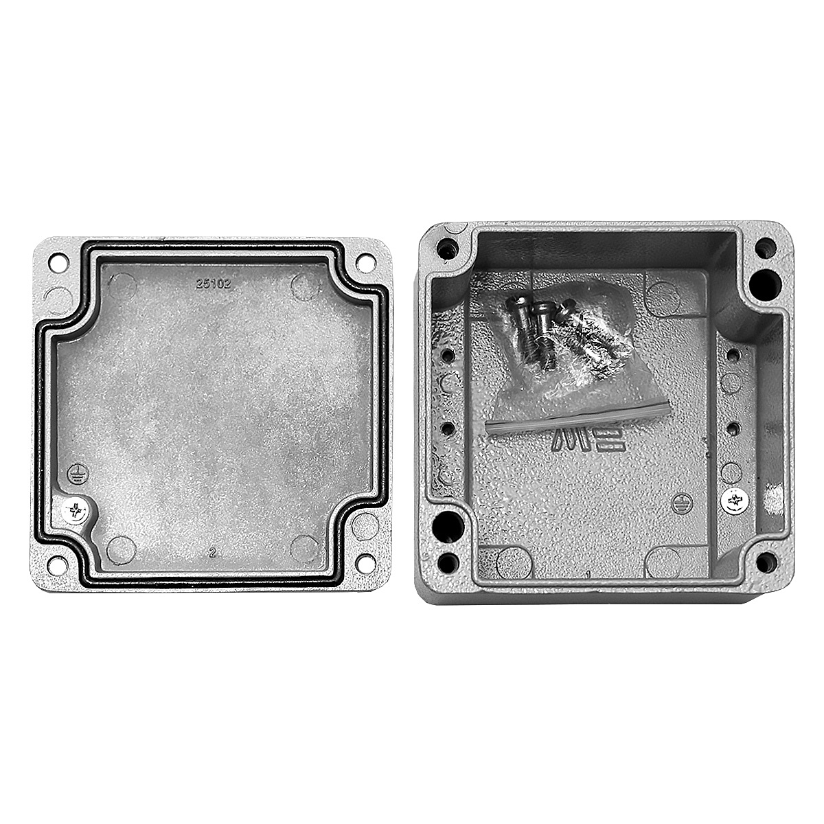 Коробка распределительная алюминиевая, 100x100x73, IP67, крепление крышки - винты, уплотнитель - полиуретан, ударопрочность - IK09, цвет серый RAL 7040, корпус - алюминий, крышка - алюминий.