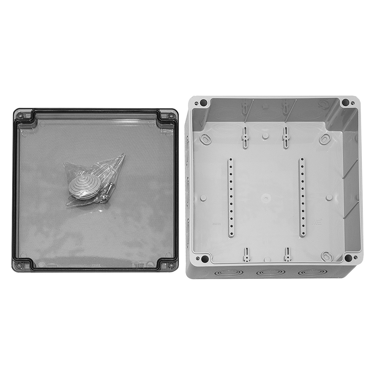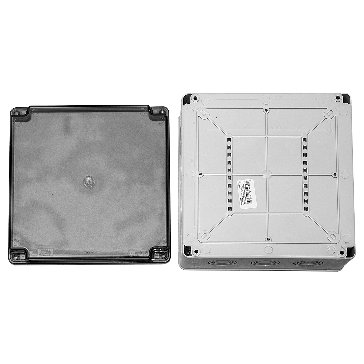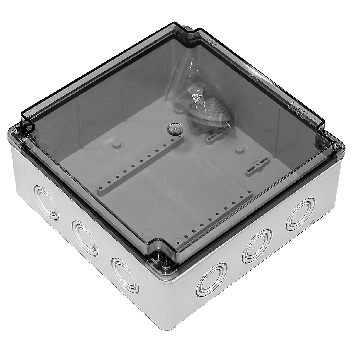 Коробка распределительная пластиковая, 210x210x90, прозрачная крышка, IP65, крепление крышки - винты, уплотнитель - полиуретан, ударопрочность - IK06, цвет серый RAL 7035, корпус - ABS-пластик, крышка - прозрачный поликарбонат.