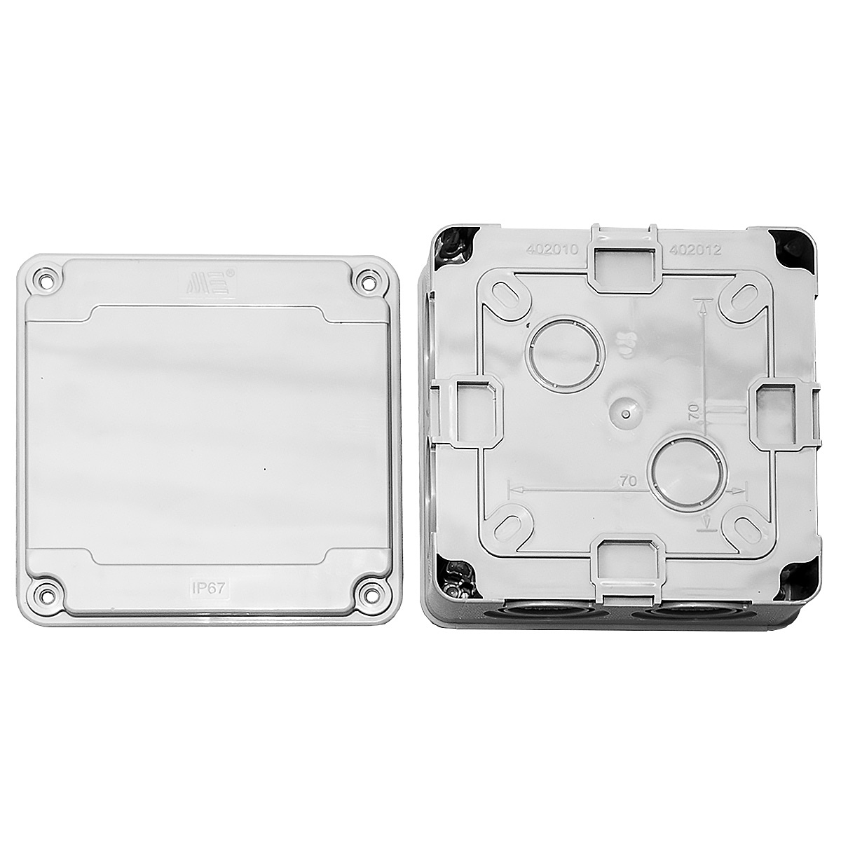 Коробка распределительная пластиковая, 110x110x65, стандартная крышка, IP67, крепление крышки - винты, уплотнитель - полиуретан, ударопрочность - IK06, цвет серый RAL 7035, корпус - ABS-пластик, крышка - ABS-пластик.